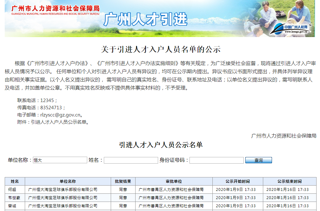 湖北1月10日讯近日,广州市人力资源和社会保障局发布《引进人才入户公示名单》,显示广州恒大球员何超、魏、申请落户广州。三名球员的公开宣布时间为1月9日17: 33至1月16日17:33。