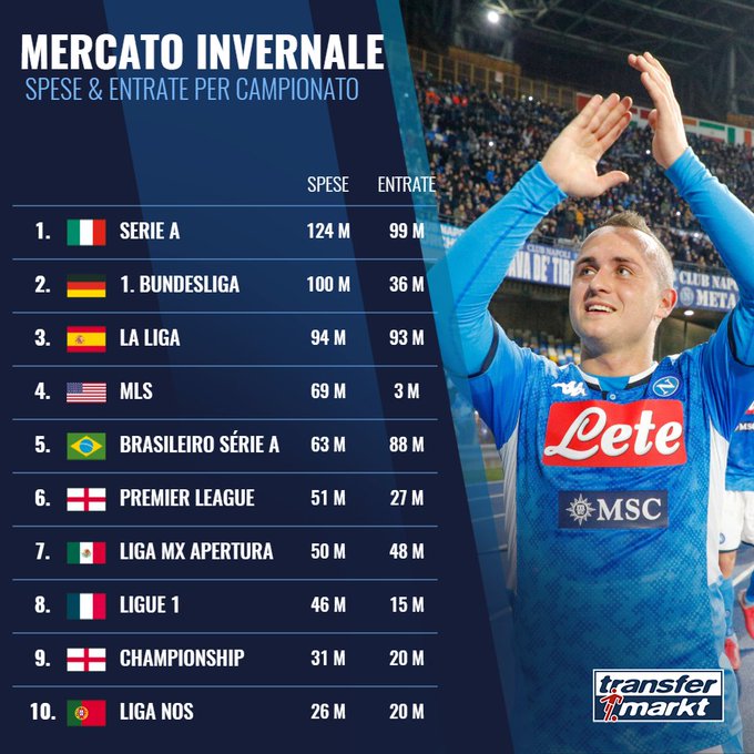 1.意甲,总支出1.24亿欧元