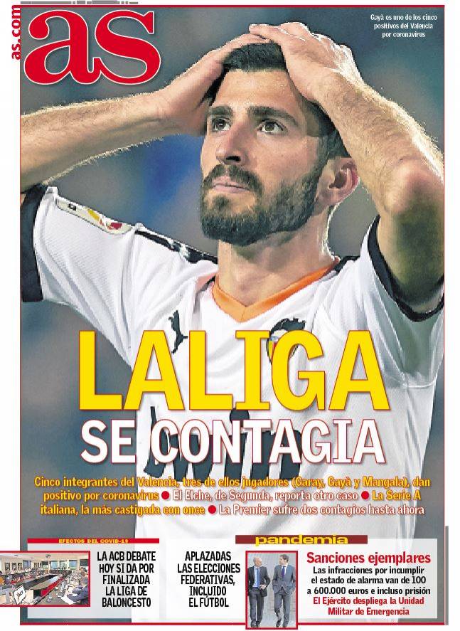1、“西甲已经被感染”,瓦伦西亚的加雷斯、加亚、曼加拉和两名教练组成员被诊断出患有新的冠状病毒,而埃尔切则是西欧第一个病例。意甲目前是确诊病例最多的联赛,共有11例,英超目前有2例。