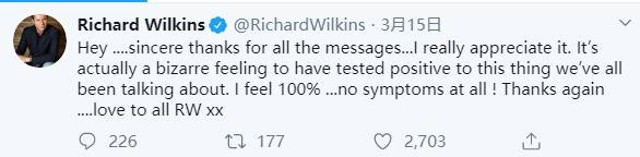 记者还在推特上写道:“我真诚地感谢你的关心。每个人都在谈论病毒。当我被诊断为阳性时,我感到有点奇怪。我现在没有症状。再次感谢大家。”