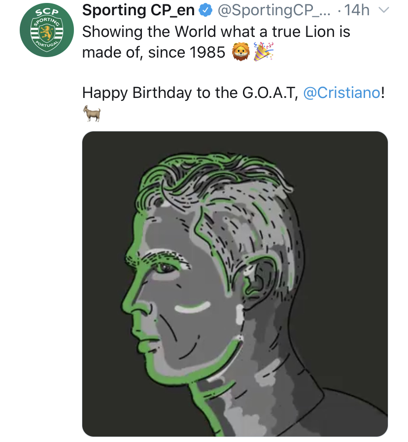 葡萄牙语版本的推特说:“Siiiiiiu!我们的小狮子35岁了!祝历史上最好的球员克里斯蒂亚诺生日快乐!”