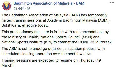 与国家乒乓球队相比,同样在赛后回国的马来西亚羽毛球队“很可怜”。在全英公开赛后,世界羽毛球联合会宣布从3月16日至4月12日暂停所有比赛,随后整个马来西亚队在紧急情况下回家,只留下李子佳和他的教练参加男子单打半决赛。