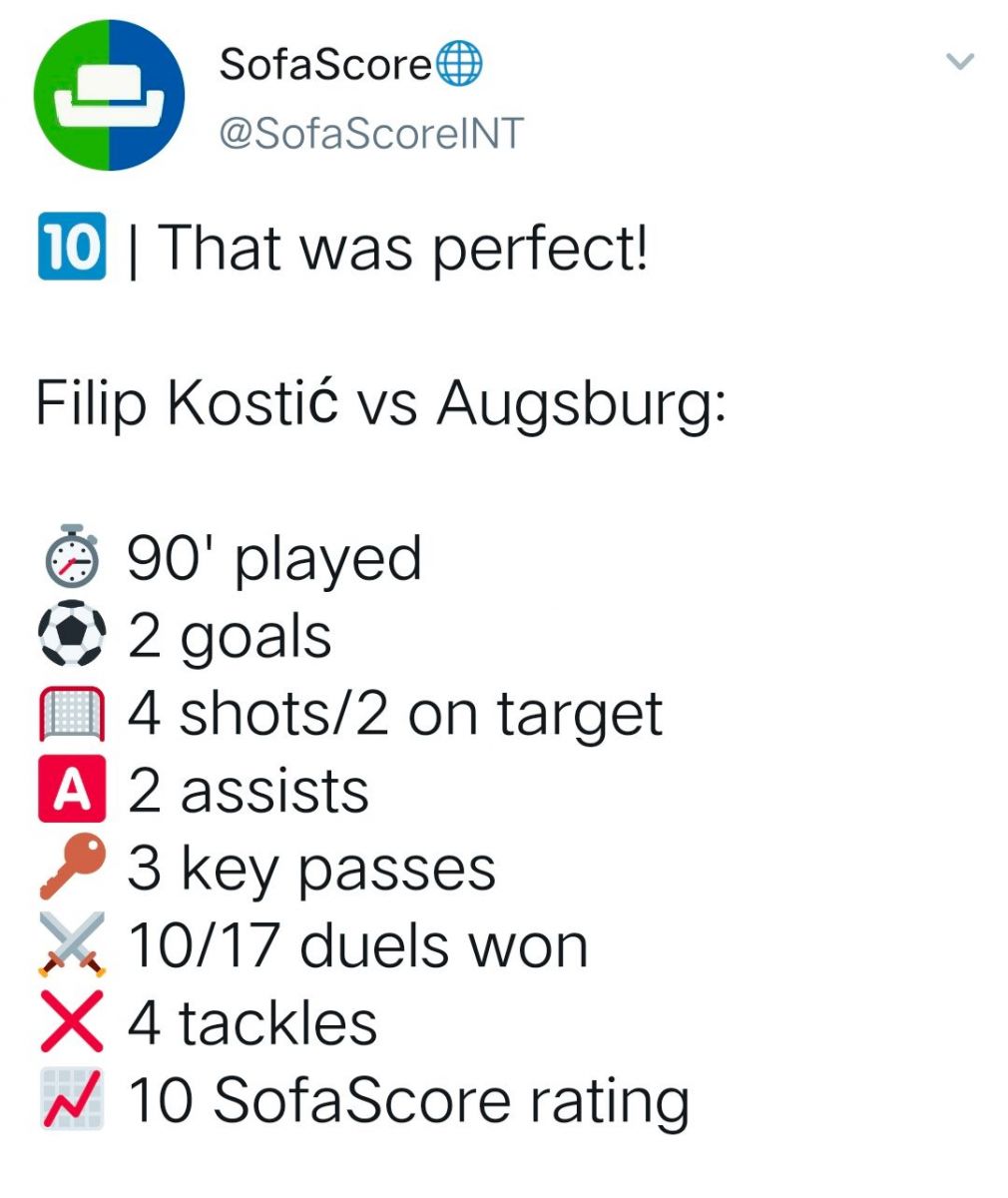 2月8日,德国德甲联赛第21轮,法兰克福主场迎战奥格斯堡。科斯特奇将军继续他出色的状态,进了两个球和两个传中,帮助法兰克福5-0击败奥格斯堡。