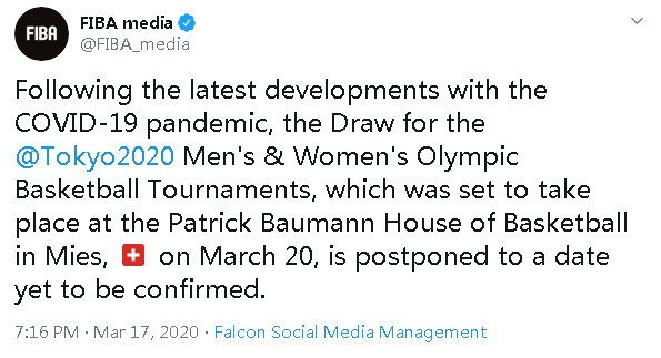 3月17日晚7点16分,国际篮联的官方推特透露,由于疫情在全球蔓延,原定于3月20日在瑞士举行的今年夏季东京奥运会男子和女子篮筐抽签将被推迟。确切的日期预计会得到确认。中国女篮参加了东京奥运会。3月1日回到中国后,他们一直在封闭式训练,为奥运会做准备。现在绘画仪式已经延期了。这表明国际奥委会和国际篮联都认为现在抽签没有什么效果,因为还不知道奥运会是否会如期举行。