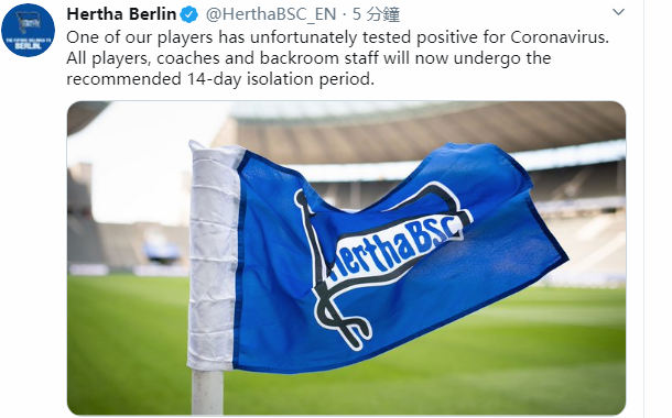 第13届柏林赫塔首都队正式宣布,柏林赫塔俱乐部的一名球员新的冠状肺炎检测呈阳性,因此俱乐部队的所有成员将被隔离14天。柏林赫塔不幸成为本赛季第一支宣布集体隔离的球队。目前,柏林赫塔还没有公布球员的名字。
