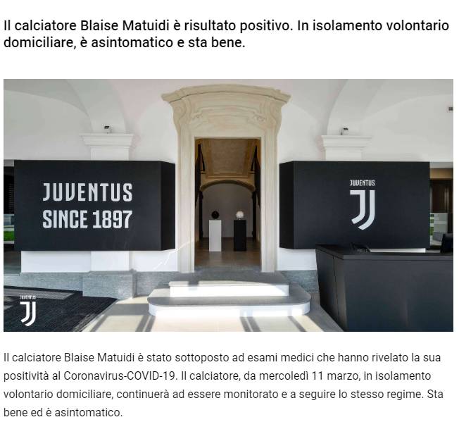 这是尤文图斯队第二个新确认的病例,由鲁加尼确认。