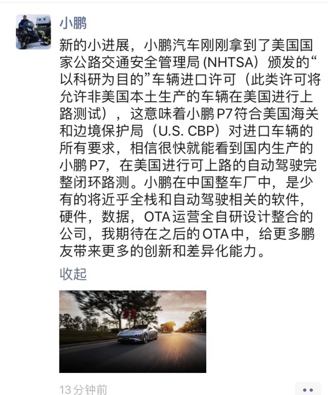 肖鹏说,肖鹏刚刚获得了国家公路交通安全管理局(NHTSA)颁发的进口车辆“科研目的”的许可证(这种许可证将允许非美国生产的车辆在美国进行道路测试),这意味着小鹏P7符合美国海关和边境保护局(美国海关和边境保护局)对进口车辆的所有要求,相信国产小鹏P7将很快被视为在美国道路上自动驾驶的完全闭环道路测试。小鹏是中国为数不多的将整合几乎所有与自动驾驶相关的软件、硬件、数据和在线旅行社业务的汽车制造商之一。我希望在未来的OTA中给更多的鹏友带来更多的创新和差异化能力。