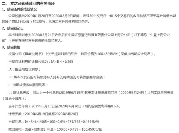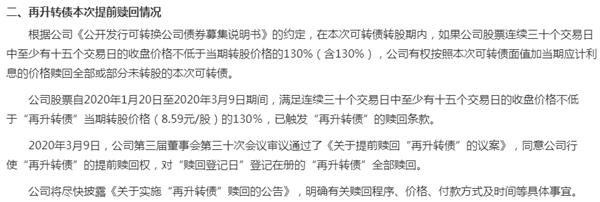 3月15日晚,再推广科技再次发布“再推广可转换债券”赎回公告,赎回价格为100.459元/张(面值加当期应计利息)。他还表示,在下一个交易日(2020年3月25日)的赎回登记日,所有在中国上海分行登记的可再转换债券将被冻结,交易和股份转换将被停止。