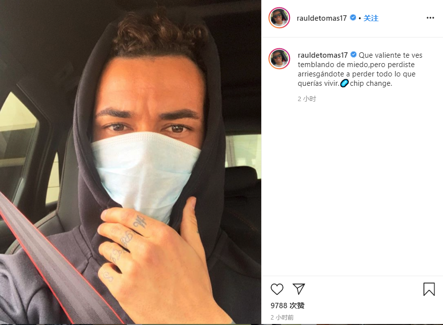 西班牙人的4名一队球员已经确认。除了卡夫雷拉还有谁?所有中国粉丝都希望武磊的名字不会出现。当《世界体育》报道了这六名西班牙人的诊断结果后,它还附上了德·托马斯的情况——就在西班牙官方宣布的前几分钟,德·托马斯在社交平台上发布了一张戴着面具的照片,并附有神秘的文字,大意是“看起来你在应对恐惧时很勇敢,但你面临着失去一切的危险”,以及“病毒”的表达。