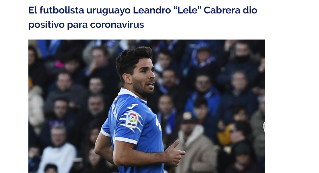 据西班牙俱乐部称,感染新皇冠病毒的六名球员和教练都表现出轻微症状。西班牙人中有乌拉圭球员卡夫雷拉,乌拉圭媒体也获得了第一手消息。在卡布雷拉被隔离四天后,电视证实卡布雷拉在周二晚上被确诊。卡夫雷拉也成为第一个感染新皇冠病毒的乌拉圭球员。