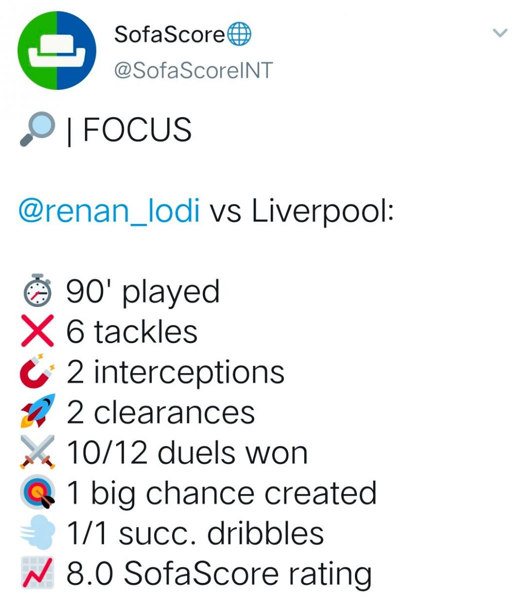 数据显示,罗提打了整场比赛,6次铲球,2次拦截,2次解围,12次对抗,10次成功,创造了一个绝佳的机会,1次成功。赛后,罗提在比赛中得了最高的8分。