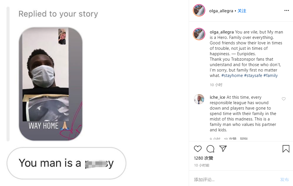 一些球迷辱骂米克尔和他的家人。米克尔的妻子也在社交平台上反击道:“你(虐待米克尔的人)是卑鄙小人。我的男人是英雄,家庭是最重要的。感谢特拉布宗粉丝的理解。我为那些不懂的粉丝们感到抱歉。无论如何,家庭是最重要的。”