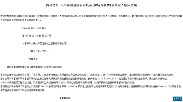3月18日上午,香港证券交易所的官方官员宣布,该公司将把新的皇冠疫苗重组为临床试验疫苗。受此消息影响,康信诺生物开盘上涨4.09%,盘中最高涨幅一度扩大10%以上,随后涨幅收窄。截至新闻稿,康信诺生物的最新股价为每股85.6港元。