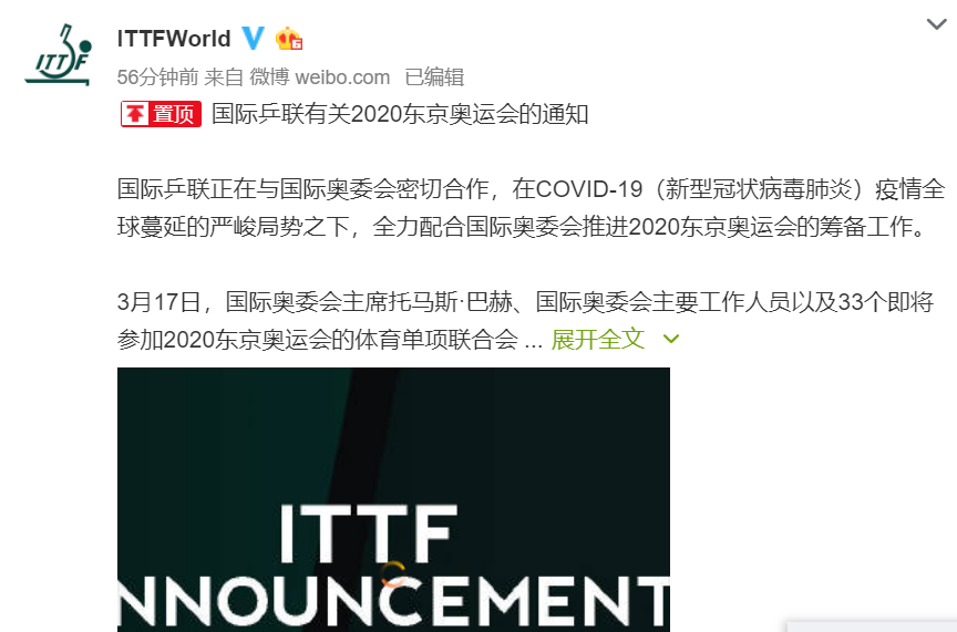 国际乒乓球联合会已经确认了公开赛的一系列延期,并正式推迟了世界乒乓球锦标赛,目前还不清楚世界乒乓球锦标赛是否会如期在6月举行。2020年,最重要的乒乓球项目将是奥运会。国际乒乓球联合会也发表了关于奥运会资格分配的最新声明。