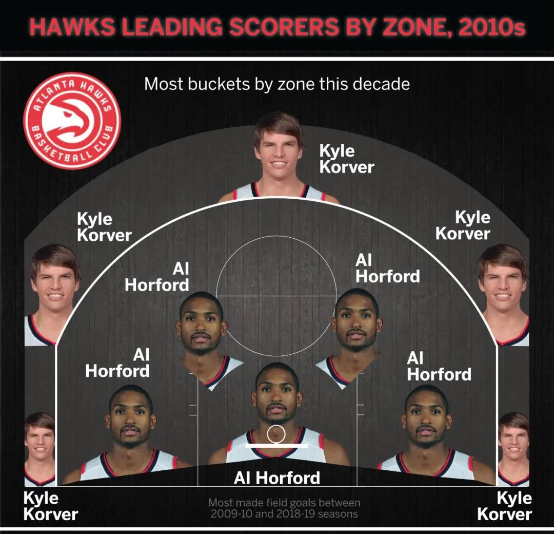 在此之前,数据专家KirkGoldsberry已经发表了一份自2010年以来在老鹰队所有区域进球最多的球员的草图。科瓦尔收缩了整个三分线。这也显示了他有多准确。