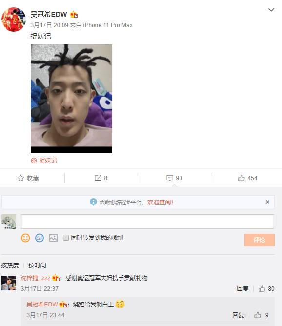 吴冠希透露了沈子杰对后者的丑陋回应:感谢奥运冠军夫 发布时间:2020-03-18
