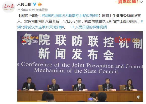 3月18日,国务院联防联控机制召开新闻发布会。国家卫生委员会发言人、宣传部副部长觅风表示,17日0时至24时,中国大陆首次没有新的疑似病例。