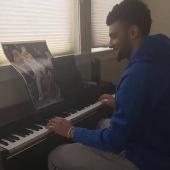 受疫情影响,NBA宣布暂停比赛。掘金后卫贾马尔·穆雷在业余时间弹钢琴。